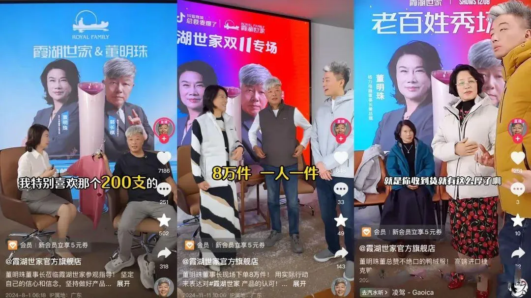 代工厂老板身世的郭氏,常常下场拍视频,从面料选择到职工日子,内容不胜枚举,自己也转型成带货网红,甚至能拉来董明珠一同站台。